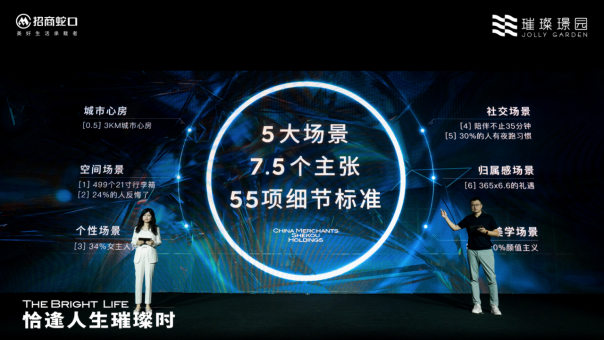 发布会上,招商蛇口产品管理部设计总监祝坚飞先生以现场连线形式为大家分享了璀璨系的设计理念和诞生故事。他表示,过去两年,总部针对全国主要城市大量青年改善客户样本进行了深入的研究,为璀璨系总结出“5大场景、7.5个主张、55项细节标准”。