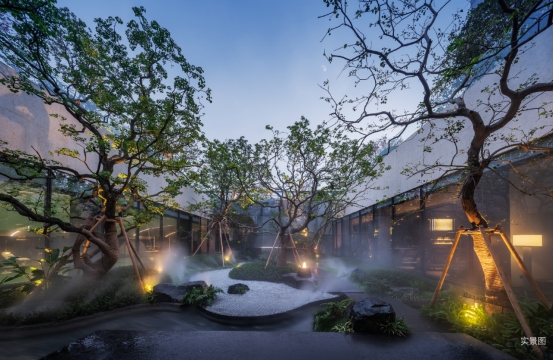 约560 m²前庭二进院落彰显入园礼序,位于四方庭院中心揽月庭暗合“天圆地方”“得水为上”的东方文化思想;移步异景,流瀑庭高约5米叠瀑式水景,仿若置身画境,将诗意层层递进。